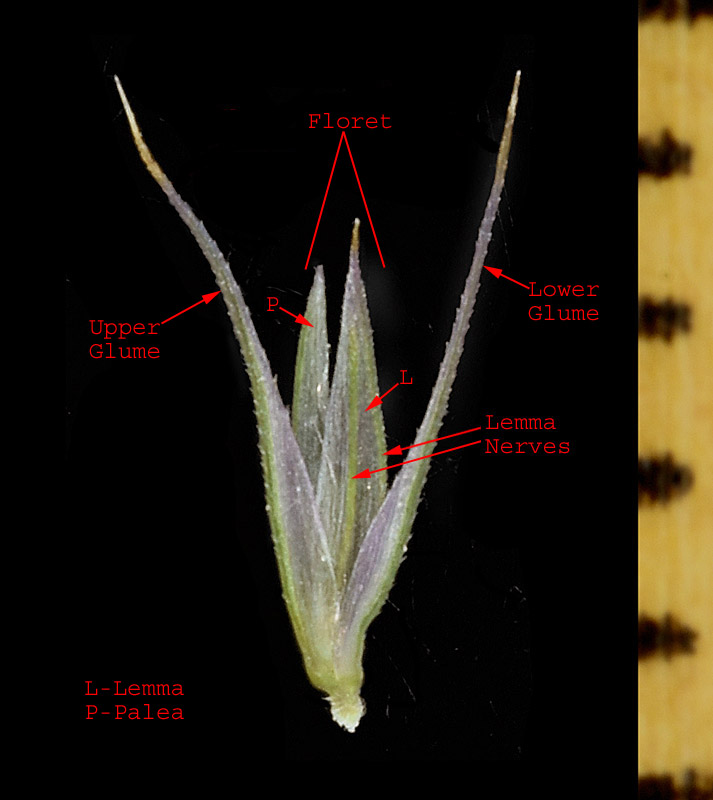 The lemma and palea from the single floret have been manually spread apart somewhat in this specimen.  The lemma is 3-nerved and the palea is 2-nerved.