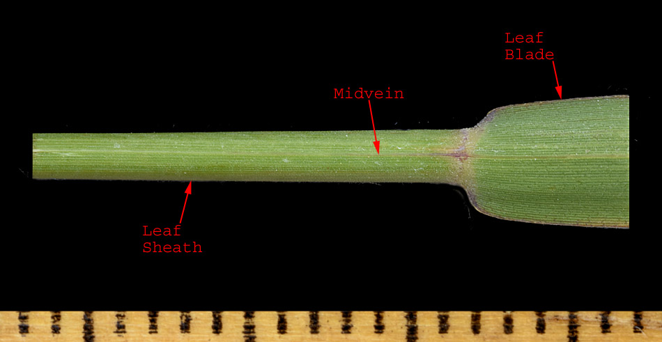 The culm has been removed from this specimen. Note the leaf blade is <= 6 mm wide and flat.  Note also the sheath midvein is visible but not prominent and the sheath is not keeled.