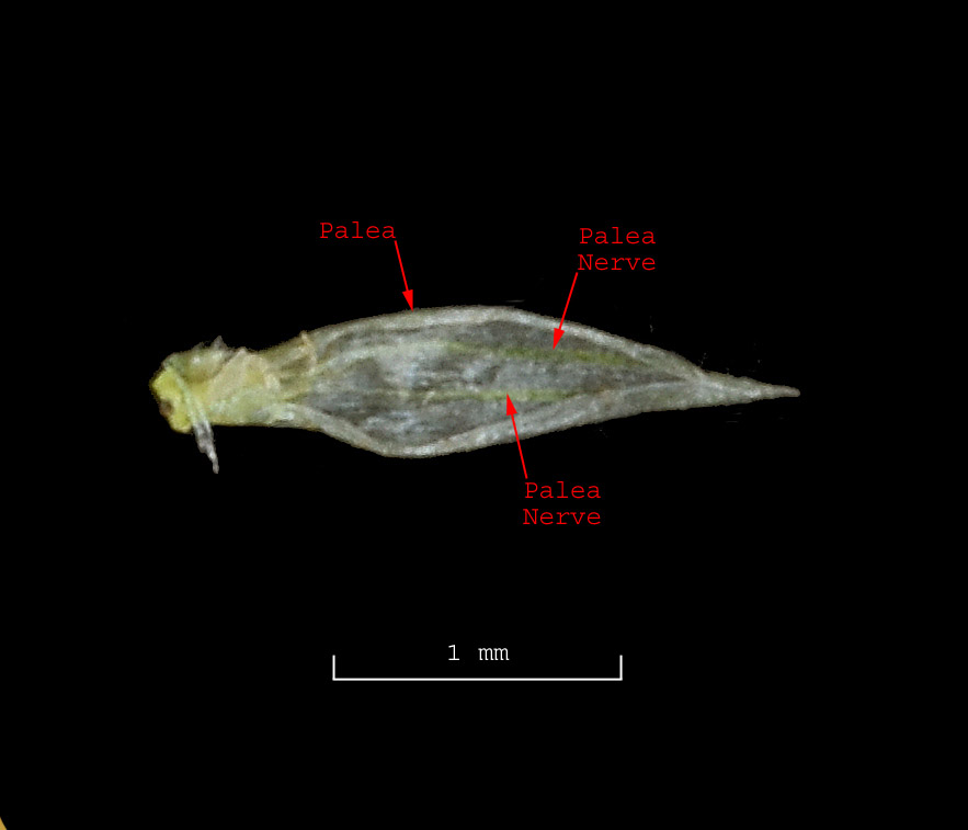Paleas ? the same length as lemmas; if paleas hyaline and as short as 3/4 lemma length, then lemmas awned from just below tip or paleas distinctly appearing 1-nerved; NOT [Paleas absent, minute or at most 3/4 the length of lemmas, thin, hyaline; lemmas thin-textured, membranous to hyaline, unawned or awned from the back]