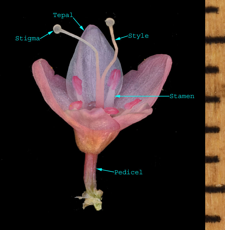 Flowers are either bisexual, such as this one, or functionally unisexual with some plants having only staminate flowers and other plants having only pistillate flowers. Bisexual flowers contain five tepals, five stamens and two styles. The pedicel is usually enclosed by connate, membranous bracteoles. However, the bracteoles have been removed from this specimen. Note the styles are more than 2 mm long.
