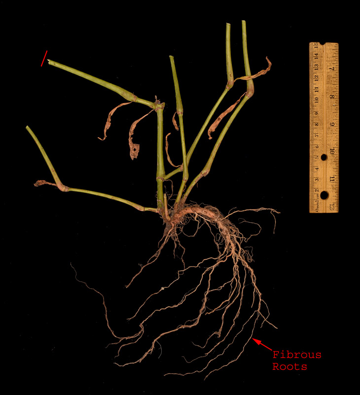 Note the plant is an annual without rhizomes. The red line segment marks where the branch in the next photo (to the right in the thumbnails) was taken from.