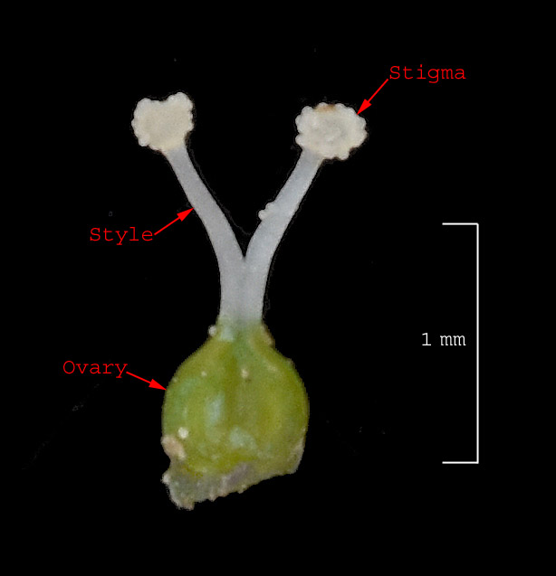The pistil has two (occasionally three) styles. Note the styles are less than 2 mm long.